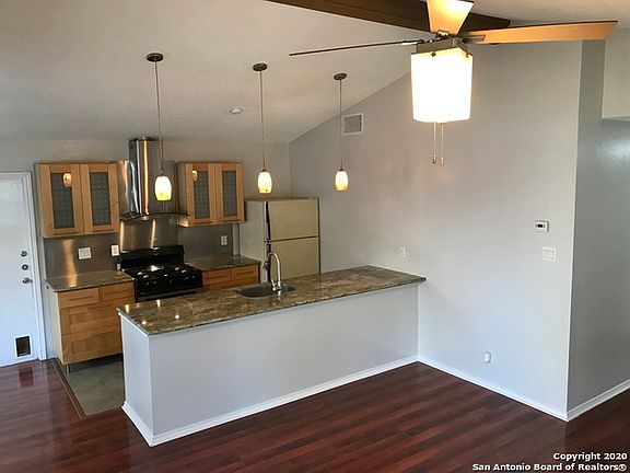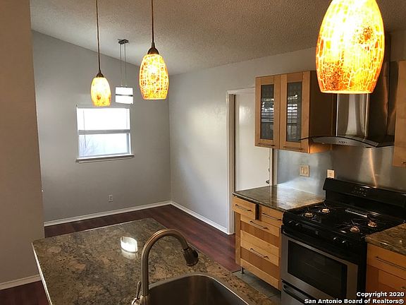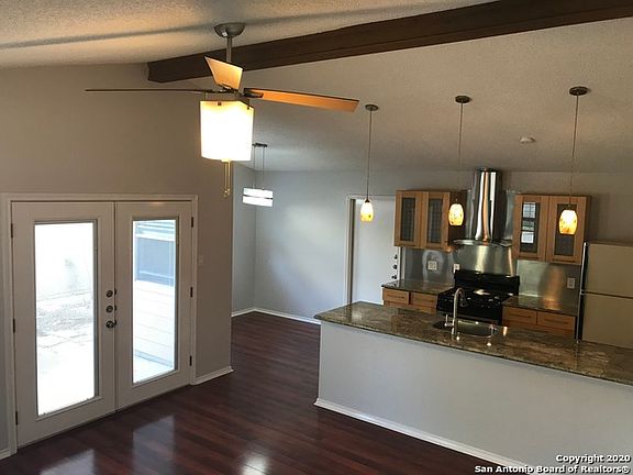 Handsomely updated home to include fresh paint, granite counter tops, sleek cabinets, french doors and updated baths! Open floor plan. Outside access to patios from both the living area and the master bedroom. Attached garage access in back. Walk to Hardberger Park, community pool or Natural Grocers!