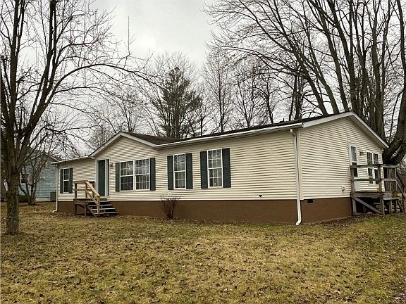 Discover this charming 1,568 sf manufactured home, positioned on a .40 acre lot accompanied by a detached two-car garage and separate utility shed that can be used for storing outdoor gear. The residence has an open floor plan, featuring split bedrooms. A spacious living room seamlessly connects to the dining area and kitchen with an additional eat-in space. Located off the dining room is the deck constructed with composite floor decking.overlooking a large backyard with mature trees.The convenience of a dedicated laundry area just off the kitchen adds to the home's functionality. All kitchen and laundry room appliances remain. Home is equipped with a Whirlpool water filtration system. The main suite offers a full bath showcasing a garden tub, separate stand-alone shower, and vanity. Three additional bedrooms, strategically placed on the opposite side of the home. LP Gas tank is owned and will remain with property. The sale is offered "As-Is," and inspections are welcomed. Sq ft & rm sz approx.