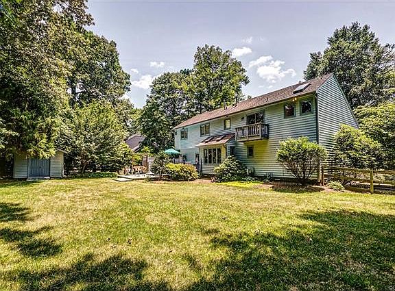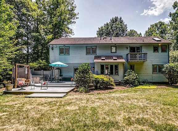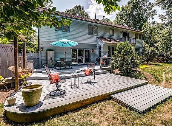 Walk to the lake from this contemporary home with 4 bedrooms and 3 full bathrooms, sitting on one of the largest lots in Woodlake's waterfront neighborhood, Beechwood Point. Natural light fills the home from the many large windows and skylights. High ceilings add to the bright and open feel of the living and family rooms, which are connected by a see through fireplace with brick and stone surround. The tastefully updated eat-in kitchen offers plenty of cabinets and counter space, as well as stainless steel appliances. A spacious first floor bedroom and bath could easily be used as a first floor master or an in-law suite. Upstairs, the elegant master bedroom features a sliding door for access the deck, a large closet, and an updated bath with shower, jetted tub, and double vanity. The yard is beautifully landscaped, irrigated, fenced in the rear, and has a large deck for entertaining. A two car attached garage, as well as an outdoor storage shed ensure plenty of storage. Community amenities include walking trails and playgrounds, indoor and outdoor pools, and tennis courts - all in a neighborhood with easy access to highways, shopping, restaurants, and recreation.
