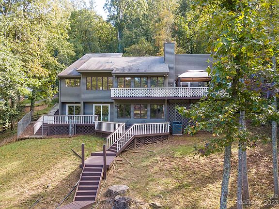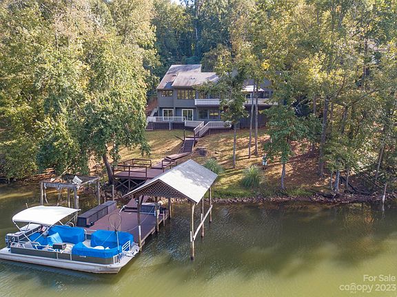 Lovely lakefront home with delightful views of Lake Wylie from most every room! 2-story Great room w/ a beautiful rock fireplace, expansive windows and picture perfect views. Deck access from every bedroom, you'll enjoy relaxing on one of the back decks with your favorite book, beverage, music, and a tranquil water view! Primary bdrm on the main flr with ensuite bathroom. Laundry room located on the main flr and could be used as a drop zone just inside the garage entrance. Kitchen has lots of storage and convenient breakfast area. Dining room located between the kitchen and great room has large windows overlooking the water. Downstairs in the walkout basement are two bdrms and one full bth. A Large rec room. A private floating dock and covered boat slip on a quiet cove opening to the main channel. On 1.29 acres, w/ private wooded road. No HOA fees. Newly painted exterior. Agent owned. Enjoy your own private lake get away yet live close to shopping, dining, uptown, & airport.