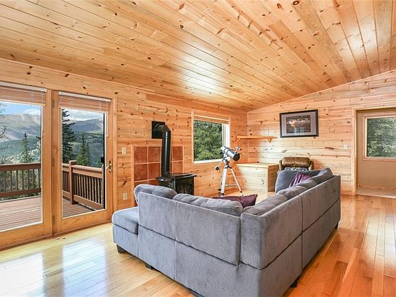 Amazing mountain getaway with expansive, unobstructed, pristine views. Relax and enjoy the two spacious living areas or the many outside gathering spaces including a large deck and patios. The vaulted pine ceilings, beetle kill pine walls, hardwood floors and 2 gas stoves make this home very cozy and inviting. Easy access off Mountain View features a gated entry to a paved flat driveway with lots of parking. 900 sq. ft detached garage with an RV Bay for all your cars and toys.