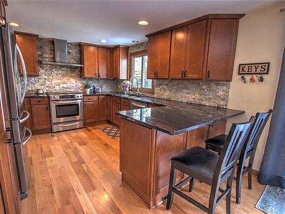 Beautifully upgraded colonial, on a 1 acre park like lot, offers 3+ car garage, custom kitchen & fabulous in ground pool. Large covered front porch adorned w/rich landscaping welcomes you into your home, where inside boasts refinished hardwood floors, kitchen w/stunning granite & stone backsplash, breakfast bar & SS appliances +built in wine fridge, LR w cathedral ceiling & remodeled fireplace and master bed w dbl walk-in closets & master bath. Home also ftrs 1st floor laundry, 2014 A/C & furnace, updated bath, central vac & plush new carpets. Finally, a gorgeous (2014) inground, saltwater pool w heater, is complimented by a stamped concrete patio, spacious grass & wooded area, bonus secondary roof covered patio and vegetable garden, all in a fully fenced backyard. Just in time for Spring! Showings start Sat Mar.16