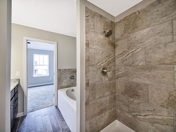 New townhome in beautiful Autumn Ridge. This home features a spacious kitchen with island and granite countertops throughout as well as a roomy pantry. Main floor has 9 foot ceilings and plenty of storage space and closets. Hardwood stairs lead up to the bedrooms and separate laundry room. Large master suite with vaulted ceiling, beautiful tiled shower, garden tub and large walk-in closet. Photos are of a similar unit in this development with a similar floor plan.