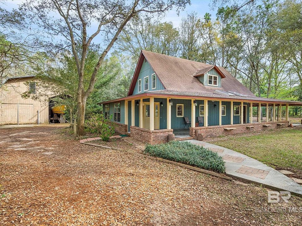 Looking for a peaceful property and the best of Country Living near all things that make Fairhope and Baldwin County so desirable? Look no further than this 3 Bedroom, 2 Bath Home on 2.5 wooded acres with hardwoods, pines and beautiful flowering shrubs in a private setting. The 1.5 story home has an expansive front porch and an attached 2 vehicle carport. Downstairs are the kitchen, separate dining room and a large family room (study). The Bedrooms are located on the second story. The primary is large enough for a king size bed and has luxury vinyl flooring. The second bedroom fits a queen size bed, has loads of storage with three closets and has an egress window. The third bedroom is a smaller room. Other features include custom cabinets and banister for the stairway which are made from the family’s grandfather’s cherry tree! The banister is moveable to allow furniture to fit up the stairs. The home is heated with ground source heating and air conditioning and the kitchen has a gas stove. The house is connected to Belforest City Water for drinking and the heat pump. There is a well, not for drinking, but which adds an excellent alternative source of outdoor water. In addition to the home there is a large shop, approximately 2500 square feet, heated and cooled, with a wood-working area, painting room, upstairs storage, and plenty of room to work on vehicles. There is also a small storage barn for mowers and other tools. If you are ready to get away from crowded subdivisions, relax and rock away in privacy on your front porch, then make an appointment to come by and see this lovely property Today!