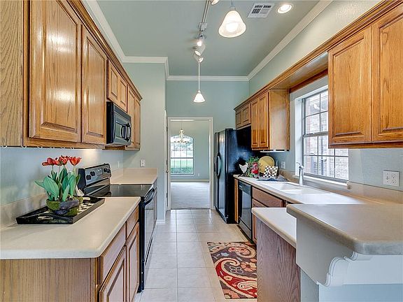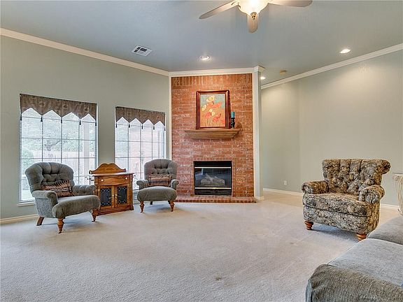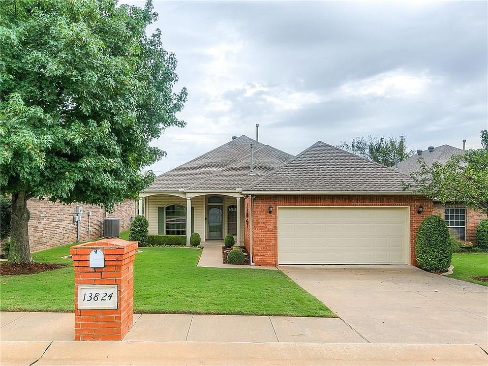 Charming home located in southeast Edmondâs Oak Hollow addition! Enjoy the convenience of this gated community where you have access to a pool, rec center, and your front and backyard are mowed on a regular basis! Beautiful exterior with lush flower beds and a front porch to sit on and enjoy. Just off of the entry is a spacious formal dining room which leads right into the living and kitchen. Living room with a lovely brick fireplace and two large windows overlooking the backyard! Kitchen w/ bar seating, neutral Formica countertops, & a pantry. Large master bedroom with sliding glass door leading to back patio, and master bath with double vanities, oversized whirlpool tub, and walk-in closet. Secondary bedrooms with ceiling fans and one has connecting bath. Landry room with folding space, clothes rod, & cabinet storage. Enjoy the covered patio in the backyard as you gaze upon the mature magnolia tree & beautifully maintained flower beds! This home wonât last long! Safe room in garage!