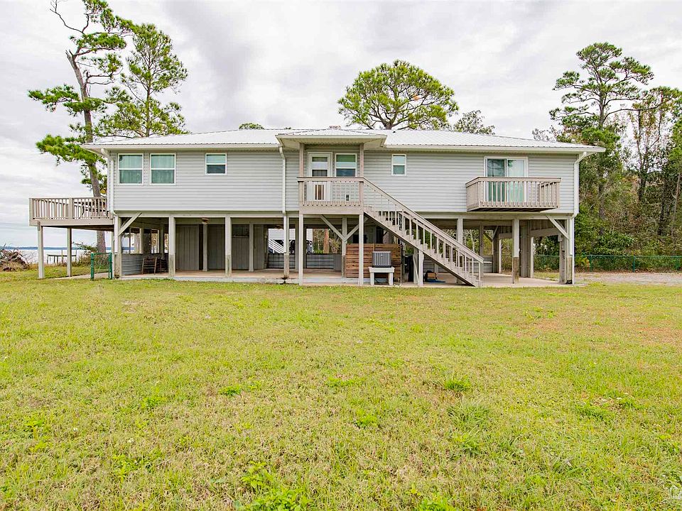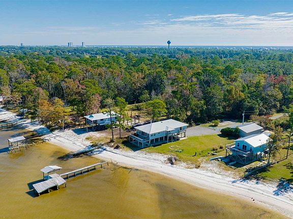 Looking for waterfront property? The current sellers have thoroughly enjoyed this as their vacation home but it could easily serve as a great forever home if you see yourself living full time directly on Bon Secour Bay. This home is set on pilings and has everything you need to live the good life. The home features low maintenance tile and luxury vinyl plank flooring as well as a neutral color palette throughout. The spacious living / dining combo comes with a wood burning fireplace, ceiling fan and double glass doors leading to the sunroom which makes a great additional living area.The large kitchen is furnished with a butcher block style center island, refrigerator, dishwasher, oven/cooktop, wine cooler and a large picture window with amazing views of the bay. In the primary suite you will find a nice sized bedroom with a walk-in closet and the primary bath boasts double vanities and a tub/shower combo. The additional bedroom is adequately sized with ample closet space. An additional full bath rounds out the interior and includes a single vanity and shower with bench. The covered 2 car carport below could make a great outdoor entertaining space and the perfect spot for enjoying the cool bay breeze. The property also includes a detached garage. This is a great opportunity to make your dreams of waterfront living come true. Don't wait, call today to schedule a private tour.