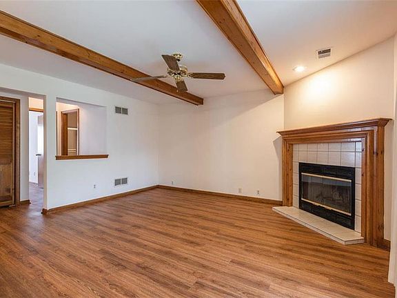 If you are looking for nice, affordable housing, on one level, this is it! New flooring, new paint, brand new range oven/ refrigerator and dishwasher. Gas start fireplace. End unit, with NICE covered deck, and yard space. Low utilities, water & trash incl in HOA. Carport, extra storage and storm shelter in building basement. LakeView is awesome, with tennis courts, pool, lots of greenspace, and a lake! Easy to show.