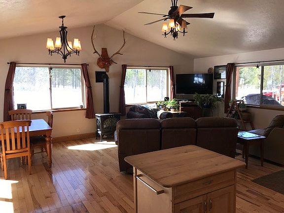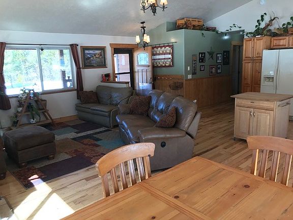 Home in a desirable location of Valley County. 10 minutes to downtown McCall. Private setting with wooded area in the backyard with open bright lighting in the front yard. Fully fenced for your animals. Large outdoor shed building with covered parking for your snowmobiles and storage area. Large fire pit for family campfires. Plenty of room on the property for a barn or shop and to add additional space onto the home if desired.