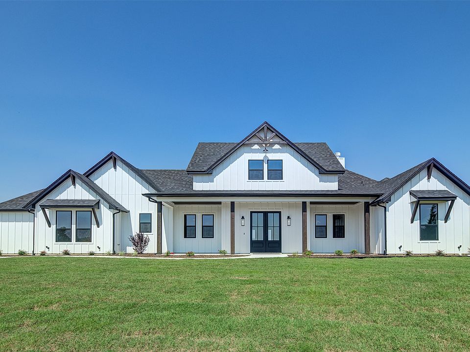 Spacious 4,3,2 modern farmhouse on 2 acres boasting 40x22 back porch with beautiful stained tongue and groove! Just an 8 min drive on paved roads from Decatur downtown! An inviting open concept with welcoming entry, 9 ft kitchen island, stone fireplace, and lots of light from windows across front and back, this home features primary bedroom with connecting laundry and walk-thru closet leading to a mud area with built in mud bench and inside garage entry. Large porches across the front and back of the home include views of the countryside. Luxury vinyl, granite, and tile throughout home with tilework in all bathrooms are in neutral colors that would work with many decor ideas. Plenty of room for large families with full guest bathroom for one bedroom and spacious jack and jill bathroom for 2 bedrooms with large, separate vanity rooms. This amazing floor plan includes a large linen closet, lovely walk in pantry, sliding barn doors, and walk in closets throughout! Located in Decatur ISD.