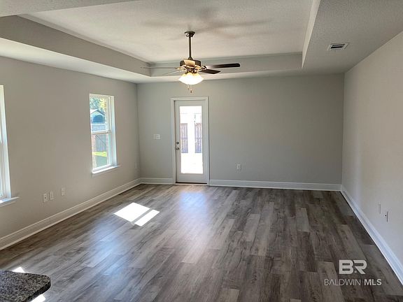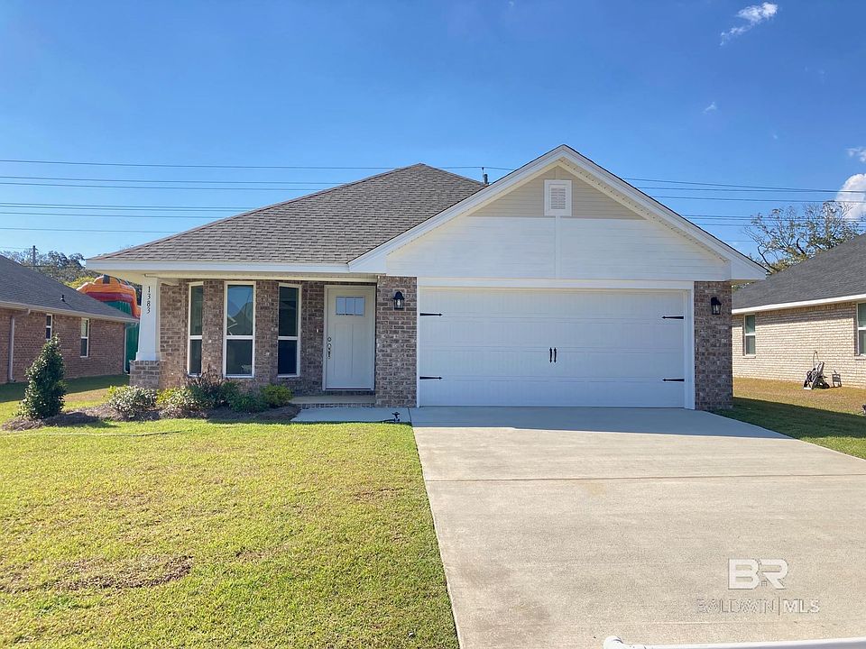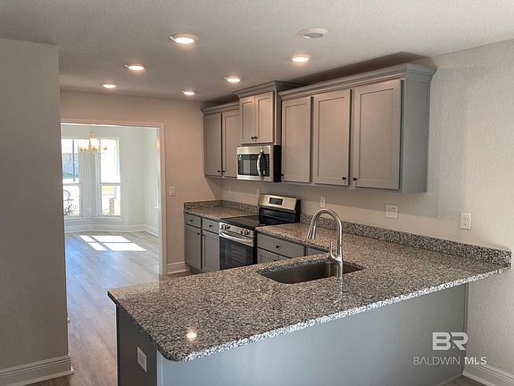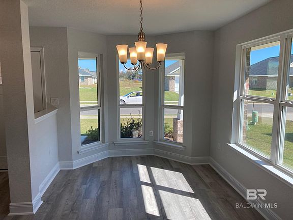 Beautiful Beaches are in your near future just 20 minutes away. This home is located in the center of Foley, with shopping, entertainment, and easy 2-minute access to the Beach Express or Hwy 59. Five minutes from amusement parks. This is a 4-sided beautiful brick home featuring lovely bay windows in the dining room flowing into the kitchen with granite countertops and stainless appliances. The kitchen overlooks the family room with a tray ceiling leading out to a corner-covered porch. This gorgeous primary bedroom has a lovely tray ceiling; a huge walk-in closet and the primary bathroom features double sinks, a separate water closet as well as a garden tub with a separate shower. Luxury Coretec flooring throughout with carpet in the bedrooms. Spacious 2-car garage. Premium hurricane fabric shields. “Builder reserves the right to modify the interior and exterior design Modifications and pricing may vary by home and are subject to change without notice. All dimensions and square footage are approx. and may vary. No representations are made by this floor plan. Photos, finishes and colors shown are representations of actual materials and are not intended to be an exact match. Please consult our sales representative for complete details “. Buyer to verify all information during due diligence.