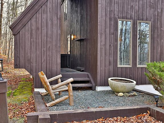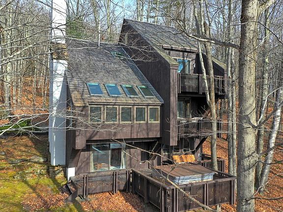 Nicely updated four bedroom, four bathroom home at Hawk Resort. Very bright open floor plan has winter views of Lake Amherst. Recent updates include cedar shake roof (3 years), renovated kitchen with new cabinetry and granite counters, tiled showers in two of the bathrooms, and refinished pine flooring. Living room has cathedral ceilings with a fieldstone fireplace, which will include a new liner and Regency insert. Bedroom, full bath, kitchen, living and dining with sliders to the deck make up the main floor. The second floor has two ensuite bedrooms, one of which also has a private deck and loft. The lower level walk out comprises the family room with large deck, fourth bedroom, fourth bathroom with sauna, and laundry room. Great four season spot in the lakes region, halfway between Killington and Okemo. This home is offered furnished.