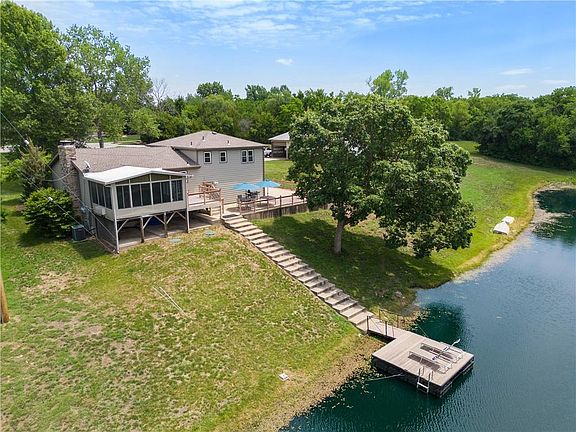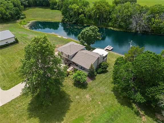 Looking to escape to a serene and picturesque location? Look no further than this stunning eleven-acre getaway, complete with a two-acre stocked pond and swimming dock. This property has something for everyone, from horse stables and spacious pastures for equestrian enthusiasts to ample garage space for car collectors. The meticulously maintained and updated home features new exterior paint, siding, roof, gutters, septic, barn, carpeting, and concrete drive. The open-concept floor plan provides stunning views of the estate and pond. The great room is highlighted by gleaming hardwood floors and expansive windows that bring light to every corner. The beautifully appointed kitchen boasts a vaulted ceiling, gorgeous stone fireplace, built-in double ovens, a walk-in pantry, stainless steel appliances, granite counters, and a breakfast bar overlooking the great room. Adjacent to the kitchen lies the dining area, cozy and inviting, with the breathtaking stone wall fireplace, making it the focal point of this area.