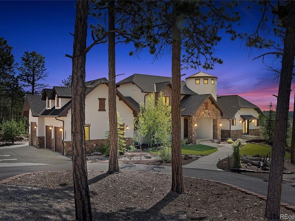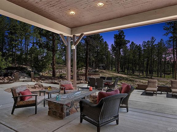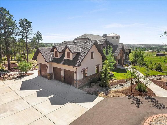 One of a kind estate with old world charm and style nestled on almost 5 acres of towering trees and meadow in sought after western Black Forest with mountain views! Custom designed and high-end construction with impeccable craftsmanship and uncompromising attention to detail. Desirable location with fantastic access to the amenities of Northgate, Highway 83 and I-25. Convenient commute to Denver or Colorado Springs. Zoned for horses and outbuilding friendly. No HOA or covenants. Large spiral staircase inside the turret. Expansive gourmet kitchen with an abundance of high end two-tone custom cabinetry, floor to ceiling stone accents, metal accents on the island, wood beamed ceilings, island seating for 6, hardwood floors, slab granite counters, seamless cabinet front Jenn Air refrigerator, Ice-O-Matic Ice Machine, 2 dishwashers, double oven, 6 burner Dacor gas cook-top with pot filler and over-sized vent hood with tile and stone accents.