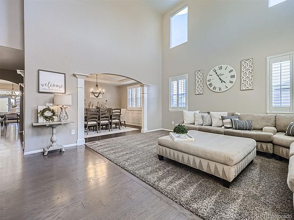 Welcome to 13836 Trenton Street. This highly sought after Lenox II floor plan is hard to come by. Featuring 8 bedrooms, 6 bathrooms and a beautiful and well thought out finished basement, this home has so much to offer. The main level features a beautiful 2 story great room with large windows showcasing the grand staircase. The great room opens up to an elegant formal dining room with custom pillars and elegant wainscoating. The large gourmet kitchen is breathtaking and opens up to a large family room with a beautiful fireplace. The main level also features a large bedroom with a full ensuite offering flexible living including main floor primary. You will also find a powder bathroom on the main level. Coming in from the garage is a mudroom and a closet for extra shoe storage. Upstairs you will find the large owner's suite with coffered ceilings, a large sitting area, gas fireplace, a full 5 piece bathroom and a huge walk in closet. You will find 3 additional bedrooms upstairs. 2 of the upstairs bedrooms conjoin with a stunning Jack & Jill bathroom. The third upstairs bedroom has an additional full bathroom offering even more flexible living. The oversize loft brings the entire upstairs together allowing cozy living space. The large fully finished basement offers a large living/flex space, great for entertaining, a kitchenette with upper and lower cabinets, quartz counters and a quartz peninsula with full size fridge and built in microwave. There are also 3 additional bedrooms in the basement with a full bathroom. The basement also boasts additional laundry room, storage and utility room. The entire home has customs shutters and blinds on every level. The lovely Quebec Highlands neighborhood is not in a Metro District meaning you save thousands on property taxes. What this home has to offer simply cannot be explained in 2000 characters, so DON'T MISS IT.