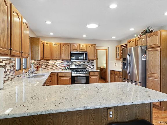 Upon entry through the covered front porch, you’ll be welcomed by the open and bright floor plan. The updated kitchen is a chef’s dream with stainless steel appliances, granite counter tops, beautiful backsplash and custom cabinetry. The breakfast bar with eating nook looks on to the cozy double sided fireplace that leads back around to the living room. Enjoy the luxury of real hardwood floors, rounded corners, and tray ceilings. It doesn’t stop there, the basement has plenty of room for flex/office/school…whatever you need. Finished with built in entertainment center with TV, game area and even your very own in ground putting green! Sitting on a corner lot, fully fenced backyard with dog run, new deck and new hot tub! Large sun setter awning with lights and wind sensor is perfect for hot Colorado afternoons. Sprinklers and drips make landscape maintenance a breeze on this professionally landscaped yard. Work or play in the finished, oversized garage with 220, cabinets/shelves/workbench. Book your showing today!