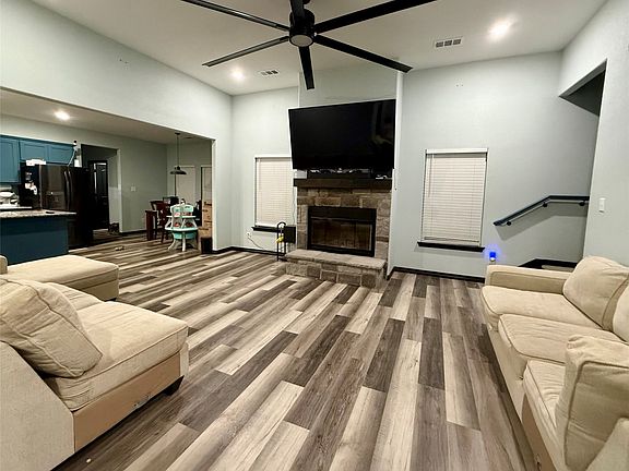 Inside, you’ll find a beautiful, spacious living room featuring a wood-burning fireplace with a stone front and hearth. The huge kitchen is a dream for entertainers and home cooks alike, offering a large island, walk-in pantry, and granite countertops throughout.