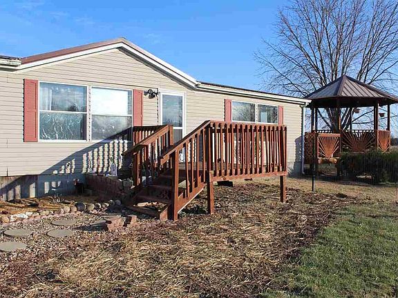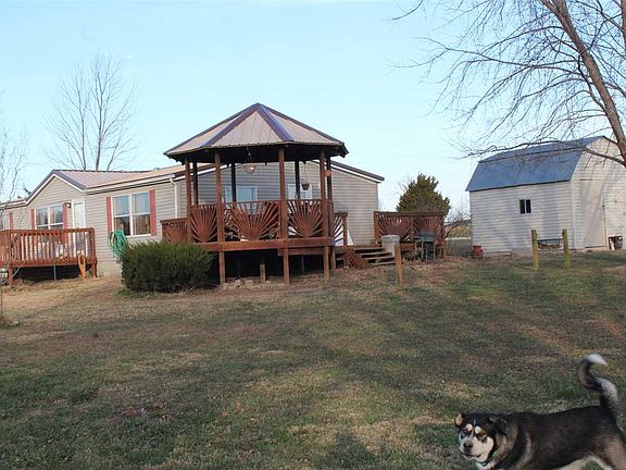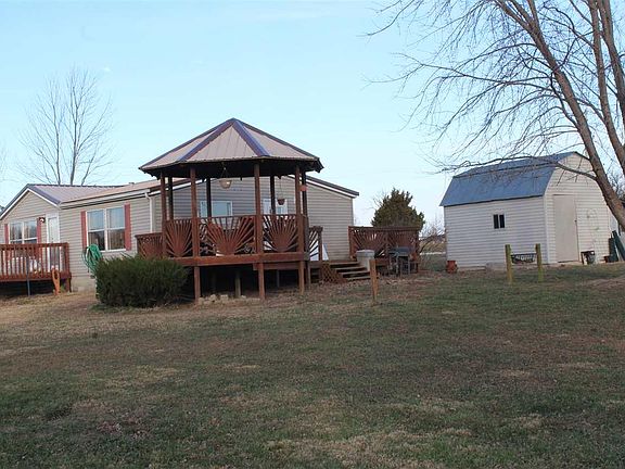 Cute 3 bdrm, 2 bath manufactured home setting on 11 acres M/L The kitchen boasts beautiful hickory cabinets, new flooring, & island area. The baths have been updated, the master with a jetted tub. This property has a spacious deck with gazebo overlooking the fenced backyard with firepit Mostly pasture land with scattered trees, stocked pond, garden spot, & 20x40 detached garage/shop with concrete floor, electricity (wired for 220). Close to many boat accesses, come take a look. Greenhouse is negotiable.