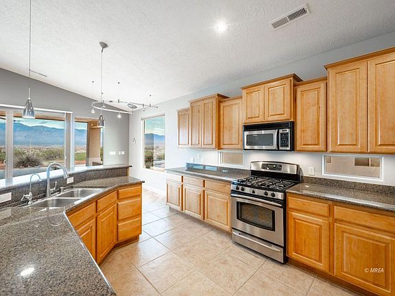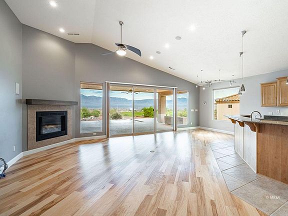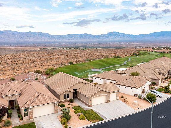Everyone loves a view. The views from the eastern oriented patio and master bedroom are absolutely spectacular. You look east to the Virgin Mountains where the moon rising will astound you. Backing up to BLM Arizona land there will be no one building behind you. You are not on the golf course but looking to the south you will appreciate the fairway views of the Canyons Golf Course. This is an open concept floorplan. There is a relatively new drip system, refrigerator and water filtering system. Relax in the patio spool. You control the temperature and jets.