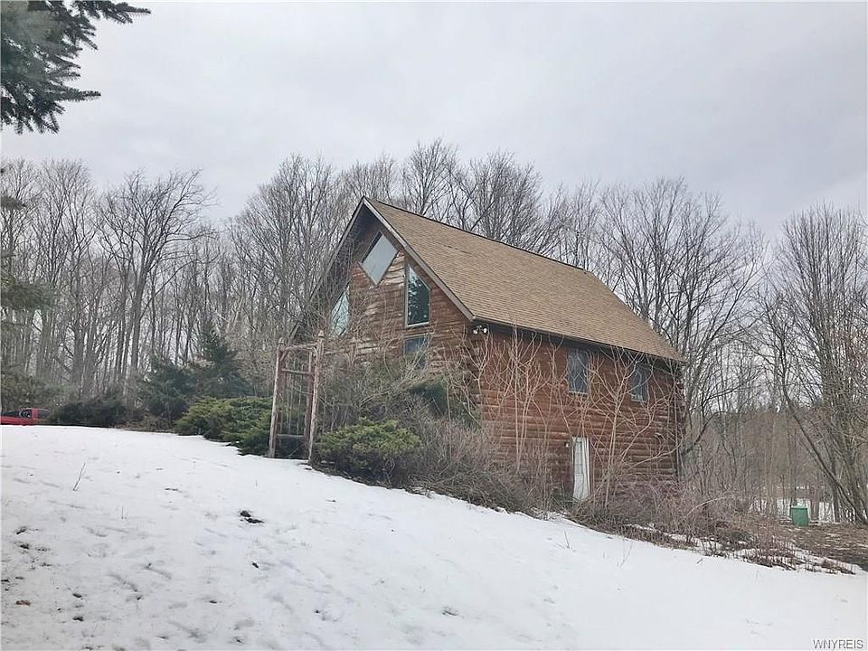 Secluded 3 bedroom, 2 bath log home on close to 7 acres. Living rm, dining rm, kitchen, 2 bedrooms and 2 full baths on 1st floor. Master BR w/ loft. Partially finished basement with third bedroom (with separate entrance) and rec room. 200 amp svc. House will need updating but great value. Great 4-car garage. Beautiful treed property with a pond. No showings until March 25.