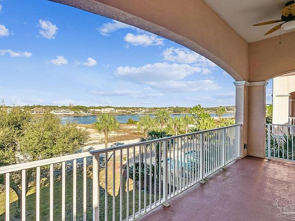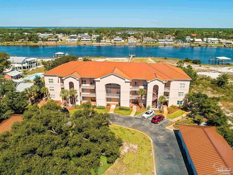 Florida living at it's finest! This is the waterfront home you have been looking for! Rarely on the market, this low density 12-unit complex in beautiful Perdido Key Beach has the perfect atmosphere for enjoying the coastal life! Perfect for a second home, vacation getaway, or a forever home. All the space you need in this 4 bedroom and 3 bath LARGE waterfront condo on the beach. Views of the Intracoastal waterway from two bedrooms (including the Master Bedroom) and main living area with a PRIVATE GARAGE! There are 3 separate private balconies to enjoy your water view! As you enter through the elegant front door, you immediately feel the expanse, giving you plenty of room to relax. There are grand 12 foot cathedral ceilings and additional tray frames, reaching a total of 15 ft ceiling height in this top floor unit. This is one of only four top floor units with that kind of luxury. The impressive open floor plan and upscale finishes of rich tile and cabinetry, granite countertops, stainless steel appliances. 7 speaker integrated surround sound system internally wired in the living room and music speakers in EVERY room (including on the balconies). New LG ThinQ see thru internet connected French door refrigerator, Hunter Plantation Shutters installed last year. Phantom Retractable Screens on main balcony slider and front door. Refinished cabinets within the few months, Freshly painted walls and New Luxury Vinyl Floor recently installed. The Master Bedroom, & Guest Bedroom have private balconies with direct view of the Intracoastal Waterway and overlook an inviting pool. The additional bedroom with its own balcony and private bath would be perfect for a guest suite. Outside you will find manicured landscaping, pool, boat dock for fishing with first come first serve boat slips with a private sandy beach just right for kayaking, swimming, or paddle boarding. New interior paint.