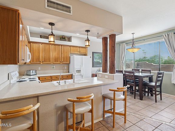 Perfect winter visitor or full-time condo living at Cornerstone Villas--FULLY OUTFITTED AND READY TO ENJOY! Great room living offers plenty of room for entertaining with a high loft area for art. The open, sunny kitchen offers plenty of cabinetry, breakfast bar seating and room for formal dining. Multiple outdoor living spaces include a spacious private backyard with covered patio and side patio, while the bedrooms each have their own patio. Features two Primary Suites with large closets and a downstairs half-bath. There's even a large 2-car garage! Cornerstone Villas features a lovely, heated pool and is walking distance to Fountain Park, shopping, dining and the fun events Fountain Hills is known for. Quick access to Shea & the Beeline make this the perfect getaway! UPGRADES & UPDATES: