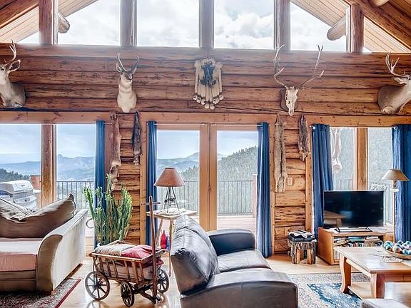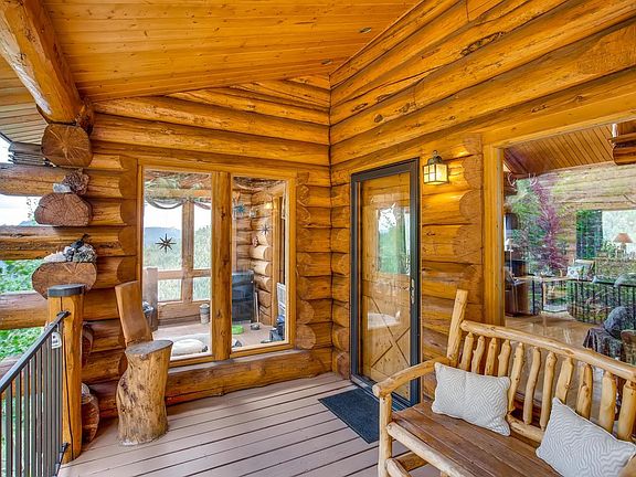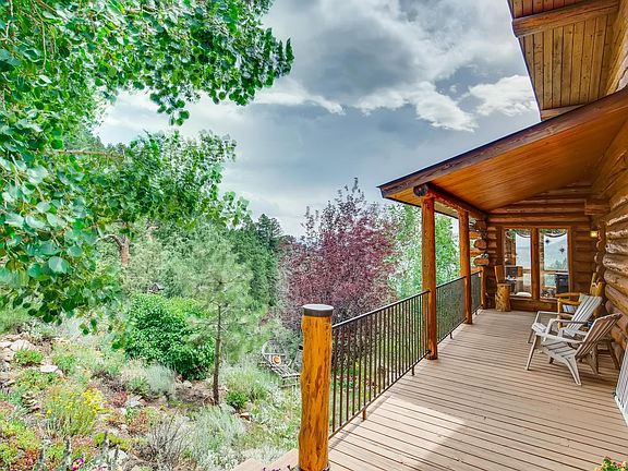 Mountains, Valleys and views of Pikes Peak form the backdrop for this carefully crafted mountain getaway on 5.7 acres. Constructed from the finest timber, log homes exude a warmth that can't be had in conventional homes. And with a huge wall of windows, a large deck, and southern exposure, this home is ideally situated to enjoy year-round living both in and out. When a break is needed, escape and reconnect with nature sitting by the creek running through your property. This home has much to offer, including; a Master Loft with full bath and amazing views; a guest bedroom and full bath on the main; and a walkout basement with 2 bedrooms, a bath, a kitchen, and a private entrance that makes it easily convertible into a separate apartment for family, guests, or for rental income. Lovingly maintained by original owner. New basement carpet. Updates to the baths and kitchen. Two-car detached garage. The roads are County maintained and the school bus stop is at your driveway. Welcome Home!