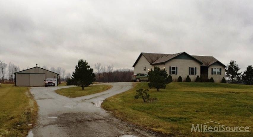 FULL FINISHED WALK OUT BASEMENT, Beautiful ranch home on 4 acres. Circle Drive, Pole barn w/concrete floor, insulated, wood burning stove, overhead door and sliding door. Entry level of home has master bedroom w/w-i-c, bath; jacuzzi tube, stand alone shower, dbl vanity, separate toilet area. 2 bdrm w/Jack & Jill bath, 2 separate sinks. 2 bdrm in bsmt, full ceramic bath, lrg living area w/carpet and door wall to concrete patio. Office area w/carpet, 14' ceilings. Bsmt living area has gas fireplace, bar and daylight windows. Lrg ceramic kitchen on entry level w/pantry, bkft bar and nook. Living room with door wall to wood deck. Additional half bath on the entry level. Home needs TLC.