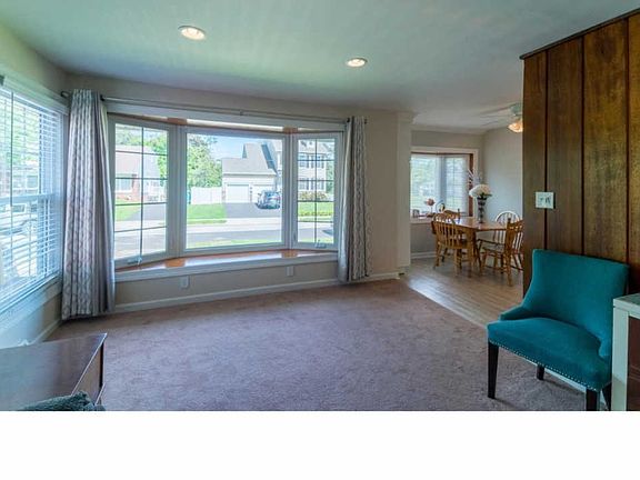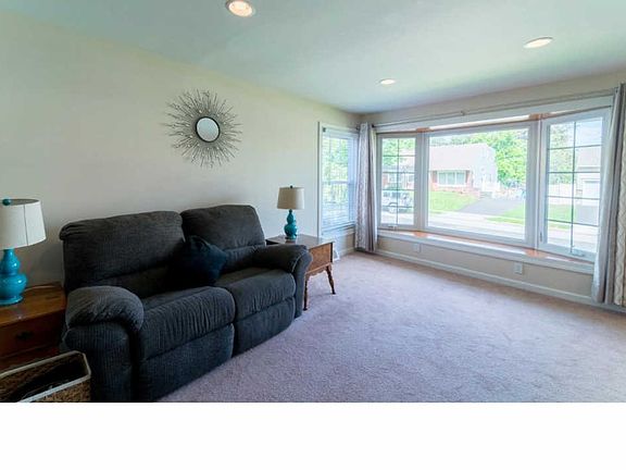 This well cared for home with central air is in move-in condition! You'll first notice the beautiful bay windows, well-maintained lawn and sidewalk in front of the house. The entrance to the home is on the side, taking you into the sizable living room with steps to the upstairs in front of you. This home has fresh carpeting throughout with the exception of the kitchen and dining area which is laid with a light hard wood laminate. The attractive, updated kitchen shows off new cabinets, countertops and backsplash and, coupled with the eat-in area flowing into the living room, makes this entire space wonderful for entertaining. The family room is to the right of the entryway and with lots of windows here and throughout the home, it's a bright and cheery space. From here, you can make your way to the bathroom and first floor bedroom currently used as a playroom at the back of the home. This space has a huge closet and can be used as an office space if desired. Upstairs you'll find three more sizable bedrooms and full bathroom. Washer, dryer and storage shelves are in the large unfinished basement that can be transformed into a game room or made over for whatever suits your needs! Enjoy ample parking on the paved driveway, plus a car park in the back of the house where you'll also note a flat, fenced-in backyard. This attractive home is laid out well for everyday living, making great use of space. It won't be available for long, so schedule your appointment to see it today!