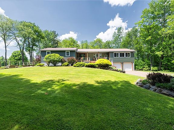 Discover this stunning updated ranch home in Constantia, offering 3,000 sq ft of living space on a private 10-acre lot. This beautifully maintained property features 4 beds and 3 full baths, perfect for family living. The upstairs features 2 spacious beds and 2 full baths, including a luxurious primary suite. Enjoy the convenience of first-floor laundry. The beautiful chef's kitchen boasts cabinets galore, & an oversized dining room. The huge family room w/ a cozy fireplace is perfect for relaxing nights. The fully finished lower level provides additional living space w/ 2 more beds & another full bath. The house is equipped w/ a whole house filtration system and boasts new siding installed in 2023, along with fresh paint throughout. For car enthusiasts, hunters or those needing extra storage, the property includes a 2-car attached garage and a new 3-car detached garage with power. The picturesque land is enhanced with 12 fruit trees & honeybees, adding to the charm and self-sustainability of this home. Experience the ultimate in privacy and tranquility w/ this must-see property. Schedule your viewing today & make this serene retreat your own! Delayed showings until 6/7/24 at Noon.