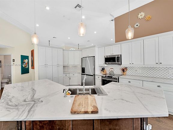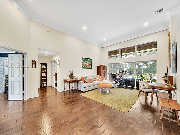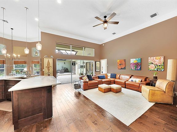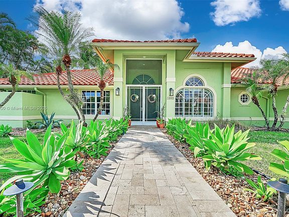 Discover this exquisite Mediterranean-style estate in the sought-after community of Meadow Wood. You are greeted by a grand circular driveway surrounded by lush landscaping. The thoughtfully designed floor plan features high ceilings and arched windows, creating a bright atmosphere, filling the space with natural light. It includes multiple bedrooms, bathrooms, and a private mother-in-law suite. The chef's kitchen is equipped with modern appliances, generous cabinetry, and stylish finishes. Step outside to a tropical paradise in the backyard, complete with towering palm trees and ample space for outdoor gatherings around the pool. This oversized lot offers privacy and tranquility. Ideally situated just minutes from beautiful beaches, dining options, shopping, and highly-rated schools.