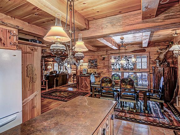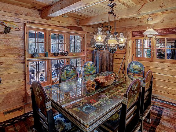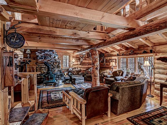 SPECTACLE LAKE ARTISAN LOG HOME - STUNNING custom built, full log home on 171 acre, pristine Spectacle Lake with a SANDY beach, a level lake approach and afternoon sun! This 3BR, 2BA home has such a unique design that you will truly be able to say that you have a ONE-OF-A-KIND! Stepping into this home is like stepping back in time. The kitchen has custom cabinets and a nice island for cooking and it spills into your dining area and living room with a cozy wood burning stove. All of this with Spectacle Lake as your backdrop through paned windows! There is a log plank stairway that leads upstairs to 2BRs and a full bath and throughout the home there are custom built-ins! Add to this a relaxing, partially covered, lakeside deck and an entryway perfect for storage. The 2 car garage has the same flavor of the home and the outside stairway leads you to a lovely room above the garage with windows for views and another stove for warmth; currently used as a bunk house for overflow guests.