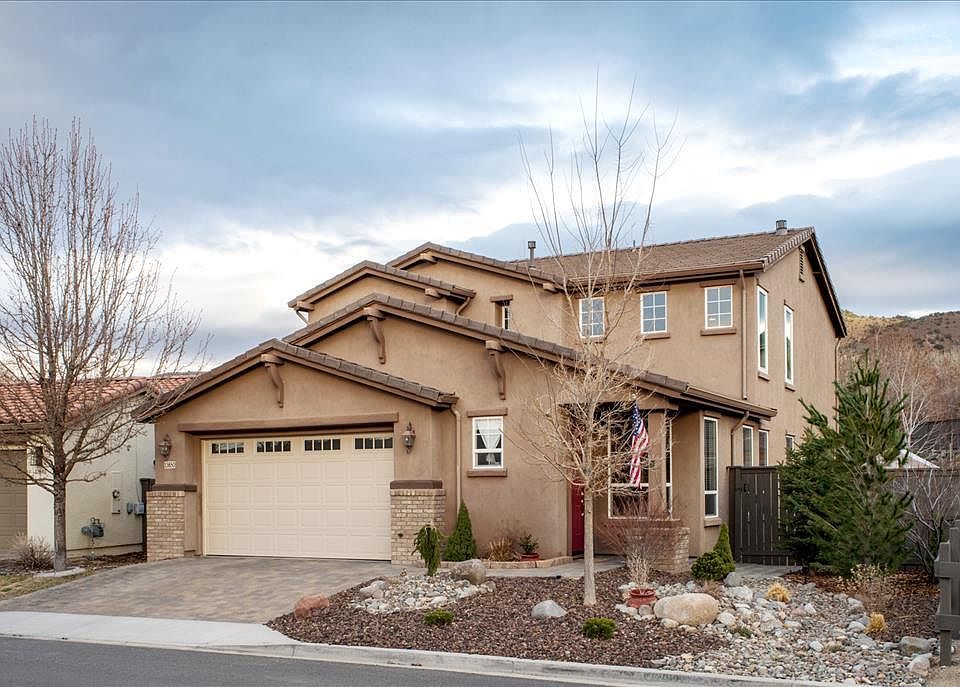 This beautiful 4 bedroom 3 bath home with formal dining and living rooms is located in south Reno's desirable Curti Ranch neighborhood. With one bedroom on the main floor and the remaining 3 upstairs, it offers options for everyone. The kitchen has granite counter tops and opens into a large family room with gas fireplace. The home features energy efficient upgrades including highly insulated windows. It features a low-water/low-maintenance xeriscaped front yard and spacious backyard with expansive brick patio. The home enjoys great views of Mt Rose and the Virginia Range and access to a network of paved walking paths.