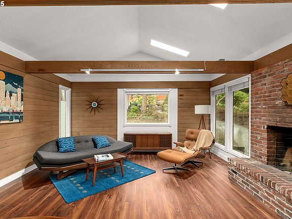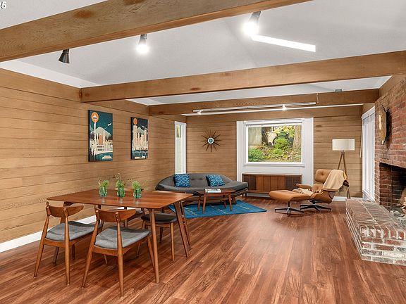 Nestled on nearly half an acre in the desirable Lake Oswego area, this meticulously maintained and beautifully updated mid-century modern home offers the perfect blend of timeless design and modern amenities.Step inside to discover an open-concept kitchen with a cozy eating nook, seamlessly flowing into the inviting family room featuring exposed beams and a charming wood-burning fireplace. The spacious living room, also with a fireplace, offers a welcoming space for relaxation or entertaining.The large primary bedroom boasts an updated en-suite bath and a cedar-lined walk-in closet, ensuring a peaceful retreat. The lower level is an ideal gathering spot, with a second family room complete with an additional brick fireplace and collapsible accordion doors, and two additional bedrooms.The oversized two-car garage includes a work area and a 60-amp line for an EV charger hookup, while the newer 50-year presidential roof adds peace of mind for years to come. Energy efficiency is a key feature with owned solar panels that keep monthly power bills low.Enjoy the benefits of new interior and exterior paint, along with brand-new Trex decking on both the front and back of the home. The fully fenced yard, enhanced by extensive landscaping, provides privacy and ample space for outdoor activities.Located just moments from top-rated Lake Oswego schools, this exceptional home combines style, comfort, and practicality. Don’t miss the opportunity to make this rare find your own!