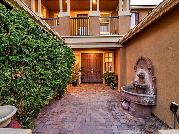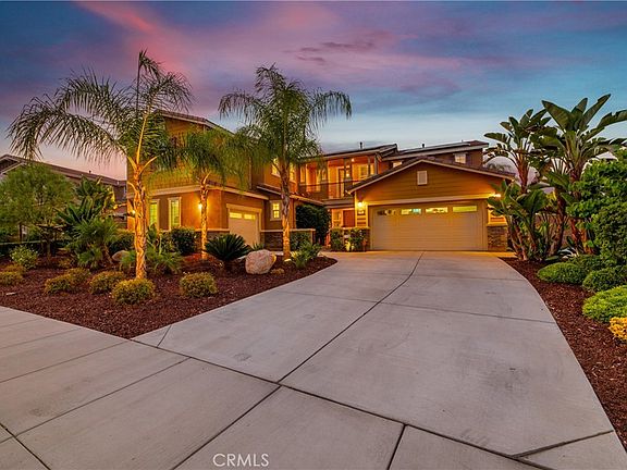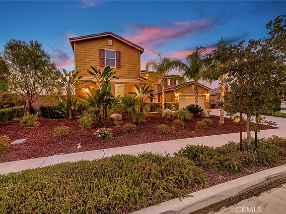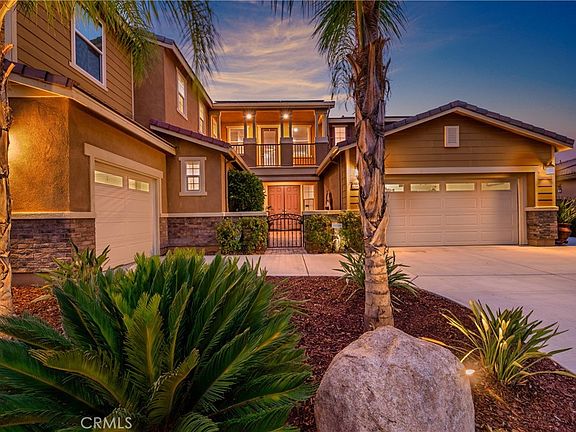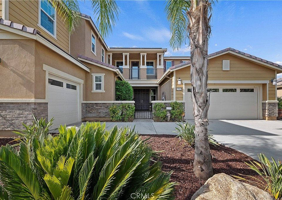Welcome to this stunning home with an ATTACHED CASITA, built by LENNAR in the CITRUS HEIGHTS community of Riverside. Enter the home through a beautiful front courtyard with stone work, fountain and landscaped greenery for tranquility. This MAIN RESIDENCE boasts a thoughtfully designed open floor plan with high-end features throughout. Enjoy engineered wood flooring, elegant shutters, crown molding and tall baseboards. The kitchen is equipped with granite countertops, stainless steel appliances, a large center island with eating area, double oven, and recessed lighting. The living room is filled with natural light from large windows and sliding doors, with a cozy fireplace to complete the space. Upstairs you will find the primary suite with a beautiful retreat area, and a luxurious en-suite bathroom with dual sinks, a soaking tub, walk-in shower, and a spacious walk-in closet. Additional features include ceiling fans throughout, surround sound, a large upstairs laundry room (washer and dryer included), leased solar, and fire sprinklers. Step outside to your own private oasis with AMAZING VIEWS, turf landscaping front and back, built-in BBQ and firepit, and an inground saltwater swimming pool and spa. The large patio cover with ceiling fans and recessed lighting creates the perfect outdoor entertaining space. This home also includes a separate ATTACHED CASITA with its own full kitchen, eating area, living room, bedroom, bathroom, laundry facilities with stackable laundry included, refrigerator, and a private 1-car garage—perfect for guests or as a rental unit. Other highlights include a soft water system, water filter system, exterior landscape lighting, a front-facing balcony, and a separate attached 2-car garage. Don’t miss this exceptional home on the west side of Riverside!