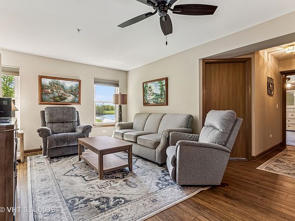 Gorgeous 2-bedroom, first-floor condo with a single-car garage nestled in the vibrant 55+ community of Carillon, specifically in the Bedford section. This corner unit is flooded with natural light and offers picturesque views of a tranquil pond and breathtaking sunsets. Beyond the pond, you'll enjoy a serene vista of the fairway on hole #2. Step out onto the covered patio from the breakfast area for a delightful outdoor experience. The master suite boasts a walk-in closet and an ensuite bathroom with a walk-in shower. A second bathroom off the hallway caters to guests and the second bedroom. The spacious living area seamlessly flows into the dining room, adjacent to the breakfast nook and kitchen. The attached garage is generously sized and provides additional storage space. Building amenities include a security system and interior access to the garage. With a new roof installed in 2019, New HVAC, new flooring, and new carpet. Carillon offers an array of amenities such as a clubhouse, golf course, wood workshop, party room, golf shop, restaurant, indoor/outdoor pools, bocce ball courts, and tennis courts, ensuring endless entertainment options. Conveniently located near shopping centers, expressways, and restaurants, this condo is meticulously maintained and awaiting its new owners.