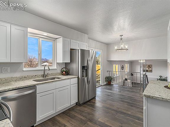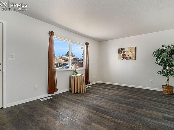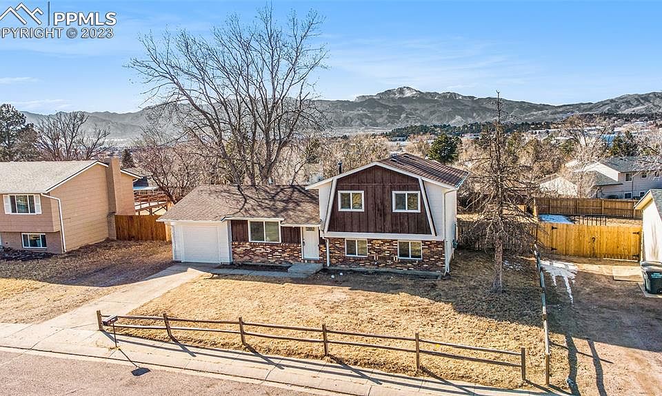 Completely renovated 3 bedroom charmer with NO HOA AND BREATHTAKING MOUNTAIN VIEWS! BRAND NEW KITCHEN! BRAND NEW BATHROOMS! ALL NEW PAINT! ALL NEW FLOORING! ALL NEW LIGHT FIXTURES AND HARDWARE! Enter the home and notice the luxury vinyl flooring on the main level and the abundance of natural light throughout the home! A spacious living area has a large window overlooking the front yard. Past the living room is the brand new kitchen that features granite countertops, new white cabinets, brand new matching stainless steel appliances and access to your attached garage with a service door that leads to the backyard. There is a nice sized eat-in area with sliders that lead to the HUGE fully-fenced level backyard with amazing mountain views to enjoy! The lower level has a large family room with a window overlooking the backyard, a bedroom, and a brand new bathroom with a walk-in shower and space for your stackable washer and dryer! The upper level has 2 large bedrooms, both with nice closet space, and another brand new full bathroom! RV parking and storage shed. Quick access to Petersen and Schriever AFB's along with the Powers Corridor for all your dining and shopping desires. This one is sure to steal your heart!