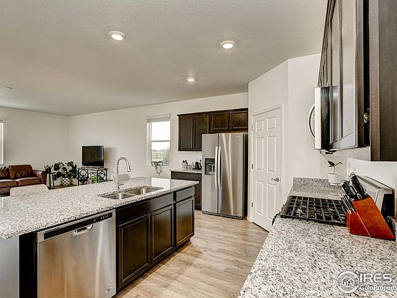 Welcome to this stunning, like new Berthoud home! Backing to open space this home provides a serene backdrop while at the same time ensuring privacy. As you enter you're greeted by an inviting open-concept design which seamlessly connects the living and kitchen areas allowing for wonderful entertaining options. The spacious great room features large windows that fill the space with natural light, creating a warm and welcoming atmosphere. The kitchen boasts stainless steel appliances, a gas cooktop, granite counter tops, breakfast bar and walk-in pantry. Enjoy the elegance of beautiful wood floors extending throughout the main level. Unfinished basement allows for future expansion and creates tons of storage or space for a home gym until then. Step outside to a large patio ideal for entertaining and grilling in the Summertime. Conveniently located near schools, shopping, and offering access to the TPC clubhouse and pool - this home has it all. Come and explore everything this fantastic home has to offer!