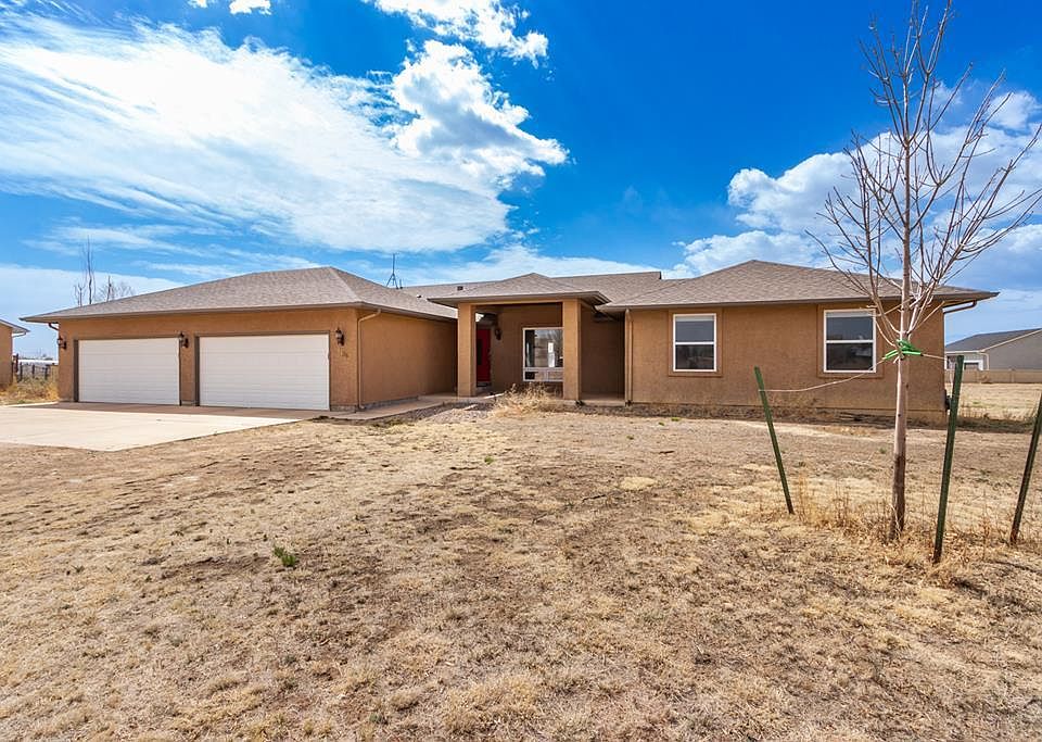 Spacious all main level living, featuring 4 beds, 3 baths and an oversized 4 car garage attached. Open concept throughout with vaulted ceilings, large living room, cozy family room featuring a gas fireplace. Oversized 18' x 12' Cook's kitchen boasting lots of custom cherry stained cabinetry with upgraded solid maple fronts, 42' upper cabinets. Stainless steel appliances, a double gas oven range, new refrigerator, dishwasher and range hood. Large island with plenty of storage, eat-in bar and adjacent dining makes this kitchen space perfect for entraining large and small. Massive master suite with a walk-in closet and 5 piece ensuite featuring a 6 foot long, deep six jetted soaking tub with pipeless technology, capable of hospital-level sanitation. Good size guest bedrooms and 2 full size guest baths. Extra large garage with plenty of work space. Large covered porches, front and back sprinkler systems installed. Excellent location close to schools and the Pueblo Reservoir.