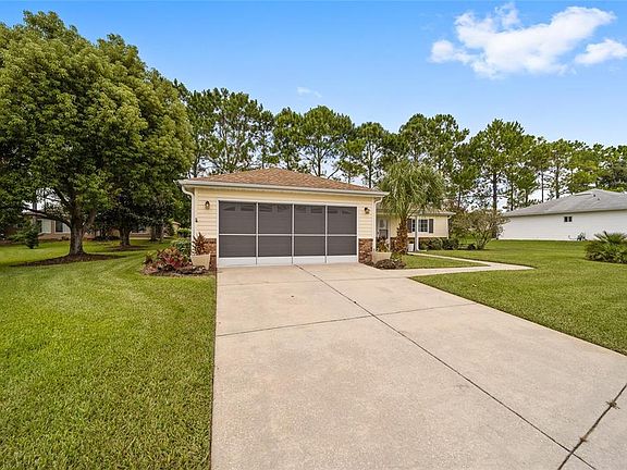 Gorgeous, serene backyard with lovely, tall pines greet you as you pull up to this home. Come see this 2/2/2 Chestnut floorplan in Candlestone located in Del Webb Spruce Creek Golf & Country Club in Summerfield. This home sits on a 1/4 acre lot with large expansive green space for side yards. Outside are great living spaces with a front covered porch and a Belgard stone courtyard out back off the Bonus Room! The Bonus Room (add'l 150 sf) is being used as a craft room and has sliding french doors into the home. It is a perfect room to sit in, kick back and enjoy the natural scenic views that flow into the home through the huge Elite windows. There is ceramic tile and laminate floors throughout the home with cathedral ceilings in the core. All window blinds are new and either go up or down. The interior has been painted in the last year. New carpet is being installed in both bedrooms Nov 2022. Both bedrooms have walk-in closets and the master has an ensuite with built-in linen cabinets and solid surface countertops. The lighting fixtures are all new throughout the home. The highly sought after open concept allows beautiful natural lighting into the home. The kitchen has solid surface countertops, backsplash and LED up-lighting on kitchen cabinets. There is pull down attic storage in the garage, a small wash sink and sliding garage screen doors. The HVAC system (2005) has seen recent preventative maintenance and is working great! The roof was new in 2015. Seller is also offering a 1-year home warranty with an accepted offer. Come see this wonderful home today!