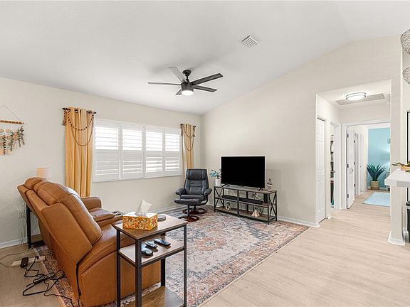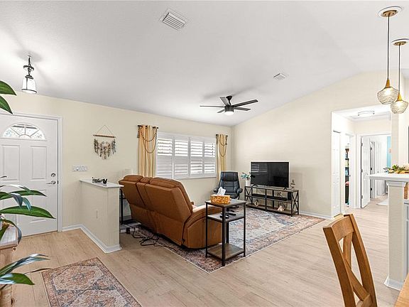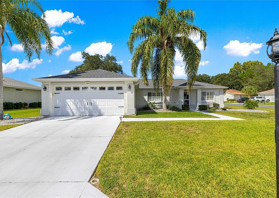 Welcome to this beautifully maintained and thoughtfully updated 2 bedroom, 2 bath Chesapeake floor plan. Located in the highly desirable 55+ Del Webb Spruce Creek Golf & Country Club. This stucco home offers 1,555 sq. ft. of living space, including the light filled Florida room, perfect for relaxing or entertaining. From the moment you arrive, you’ll notice the outstanding curb appeal, complete with a painted driveway and walkway, updated landscaping with concrete curbing, and a corner lot setting. Inside, the open floor plan is enhanced by a vaulted ceiling, recessed lighting, fresh interior paint, and a split floor plan. Interior highlights include Luxury vinyl plank flooring throughout (guest bedroom carpeted for comfort), newly purchased stainless steel appliances, plus washer and dryer (2025). White cabinetry with pull-outs, tiled back splash, and large farm style sink in the kitchen. Updated bathrooms, including an en-suite with a beautiful walk-in shower and new fixtures. Plantation shutters, updated lighting, and ceiling fans throughout, The primary suite features a bow window for added space, plus a large walk-in closet with custom organizers. Enjoy seamless entertaining with the open Florida room, kitchen pass-through, and a private outdoor patio-perfect for morning coffee, grilling out, or evening gatherings. Major updates for peace of mind are roofing re-shingled (2022) HVAC (2013), and new gutters with leaf guards (2025) for low-maintenance living. This home combines modern updates with a highly functional layout, all within a vibrant community offering golf, recreation, and endless amenities.