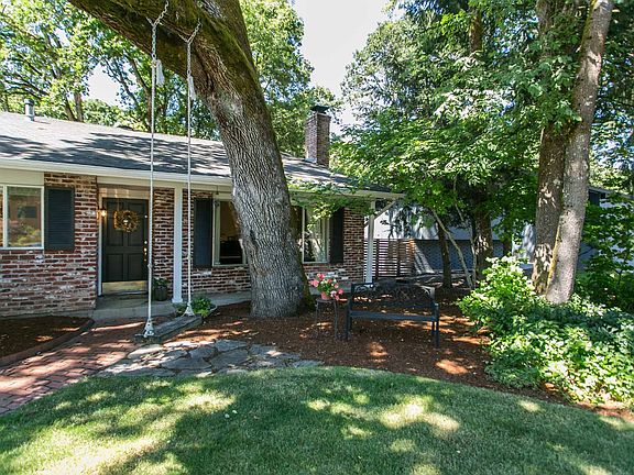 This tasteful home immediately invites you to relax on the fun storybook swing hanging from an idyllic lumbering oak tree. Enjoy hardwood floors, 2 wood burning fireplaces & a finished daylight basement that opens into a wonderful tree filled back yard with a spacious covered patio. The kitchen includes a breakfast nook, built-in desk & a pantry cupboard. The living room boasts beamed vaulted ceilings & a charming tall brick fireplace.