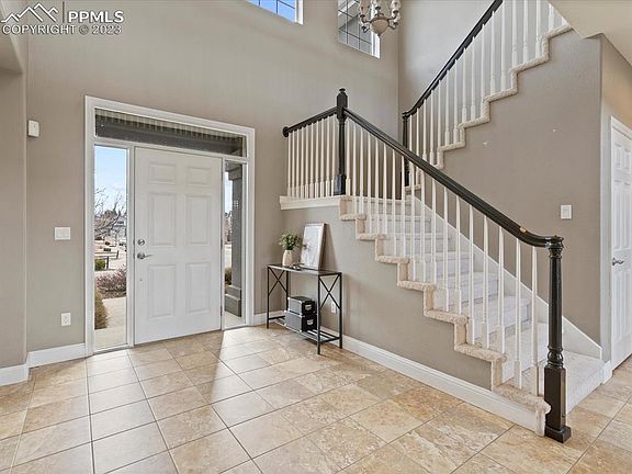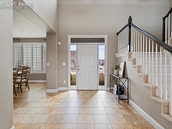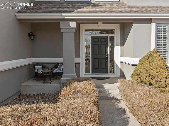 Gorgeous move-in ready home with a huge backyard nestled at the back of a cul-de-sac in Northgate Highlands. This beautifully designed home really wows you as you walk into a welcoming entryway with vaulted ceilings, stone pillars, and tons of natural light. Stunning views of Pikes Peak from the entryway and front-facing windows of the home. The kitchen and open floor plan is an absolute dream. Spacious upgraded granite kitchen counters, breakfast bar seating, gas range, double oven, walk-in pantry, and coffee bar. The living room has vaulted ceilings, matching stone fireplace, tasteful plantation shutters, and an 85in mounted TV and stereo system that is staying! Main floor also boasts a full dining room, full bathroom, large bedroom with backyard-facing windows, and a walk-in laundry room. The space in the backyard will amaze you, it feels spacious but also private with views of the front range. The home has a large concrete patio, built in fire-pit, and gas line ready for entertaining. It is fully fenced with split-rail fence and pet wire, nicely landscaped and well maintained. Upstairs the master suite is secluded from the rest of the rooms, has a bay window facing the backyard, and large 5-piece bathroom. Three other large bedrooms and a full bathroom complete the upstairs. The unfinished basement has incredible potential with 1500 open square feet. This home has a new gas range, new dishwasher, new microwave, and is set on a spacious lot in a quiet neighborhood. Come see this beautiful home before its gone.