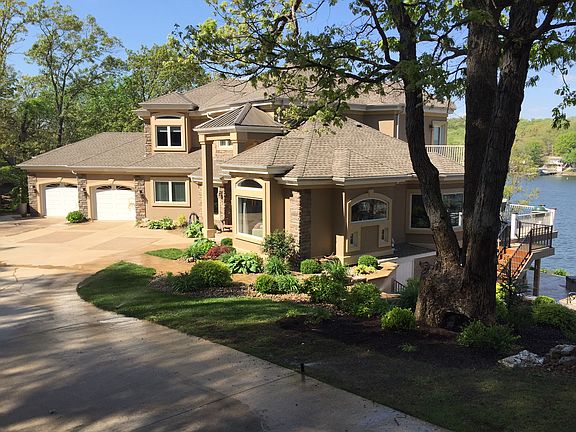This lakefront home has gorgeous views of a wide cove from most rooms, and is at the end of the road in an established subdivision in the heart of Osage Beach, Missouri. Beautiful, professional natural rock landscaping and attractive stucco with stone accents enhance the exterior. 190' of lakefront. Large 2 well dock will accommodate a cruiser and there is two covered jet ski lifts with an additional large swim or sunning area. Built in 1997, with major updates since including kitchen granite countertops, Viking range and dishwasher, fabulous pool with infinity edge, gazebo and stone fireplace, and an additional garage with attached 50' enclosed RV port. Master bedroom/bath includes huge 2 person shower, Bain tub, walk in closet with second laundry, and a private deck. This well-designed and maintained home is perfect for guests and entertaining. Situated between Osage Beach and Camdenton on a paved road makes this a perfect location. Located at the 28.5 MM in Race Track Bay, with deep water and terrific views. If buyer is represented by a realtor a 3% commission will be paid.