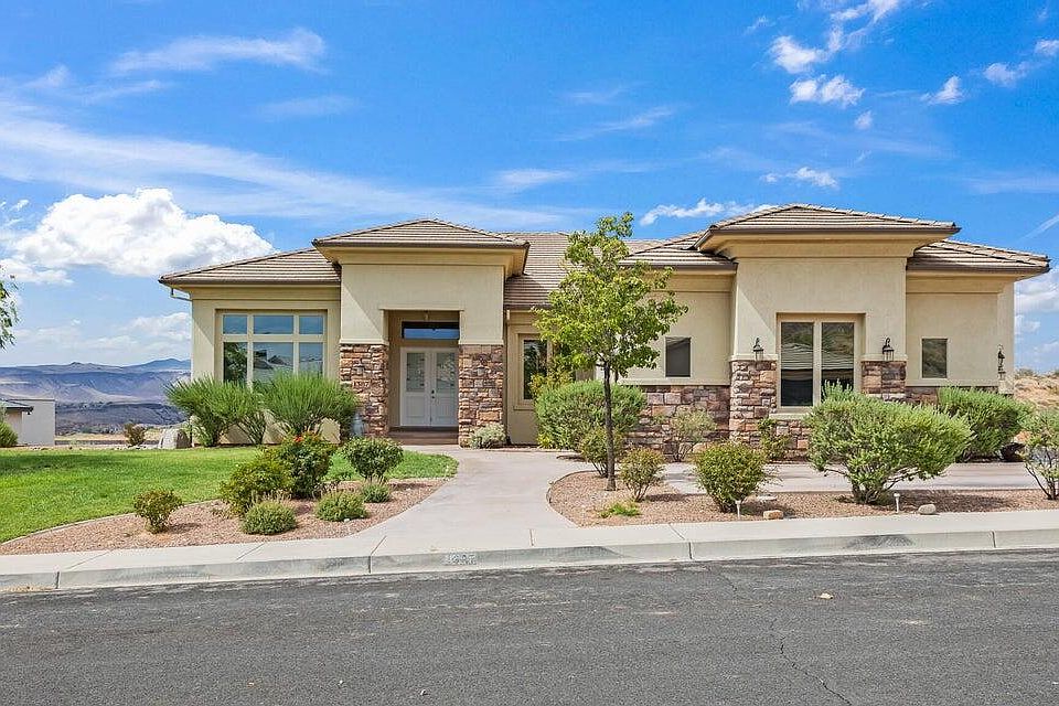 Luxurious 4 bedroom, 3 ½ bathroom dream home located on a spacious landscaped 1.04 acre lot with spectacular views and mature fruit trees. Featuring an open concept living area with high ceilings and large windows that flood the space with natural light - making it the perfect space for entertaining guests or enjoying a quiet evening with family. 2 covered decks, large patio, and private rooftop deck provide panoramic views of the valley, scenic mountains, and breath taking sunsets. The modern kitchen boasts high end appliances, granite countertops, ample cabinetry, a butler kitchen and generous pantry - making it a chef's dream! The master suite on the main level offers a serene escape with a private deck, an enormous walk-in closet connected to the laundry room, and a luxurious en-suite bathroom featuring a soaking tub, a beautiful separate shower, and ample storage drawers. A roomy home office adds the perfect touch for the entrepreneur. Three additional bedrooms, a home theater, and an exercise room provide comfort, personal space, and entertainment for family members or guests. With a sizable RV garage, private lower garage, and massive amounts of storage space, there is plenty of room for all the toys. Outside, the expansive back yard features a pool and jacuzzi with slide, basketball court, gazebo, charming grape arbor, garden, and patio area for outdoor dining, festive gatherings, relaxation, recreation, and nourishment. Enjoy the delicious bounty of more than 20 mature fruit trees including apricot, apple, cherry, fig, pear, peach, persimmon, plumb, pomegranate, and Turkish mulberry.