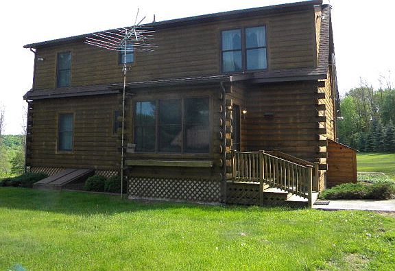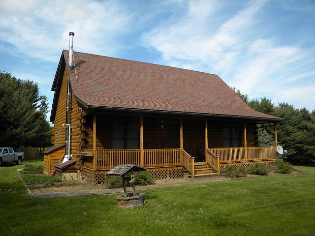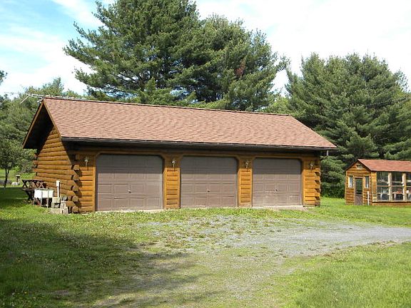 1.5 story modular home with log siding, full length front porch, 3-car detached garage, small greenhouse, large garden and storage sheds on 47.75 acres. Home has a full basement; loft area; and is in very good condition. Secluded setting with blue spruce lined lot, fruit trees and much more. Acreage is mostly wooded.