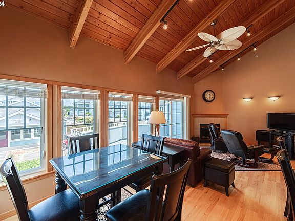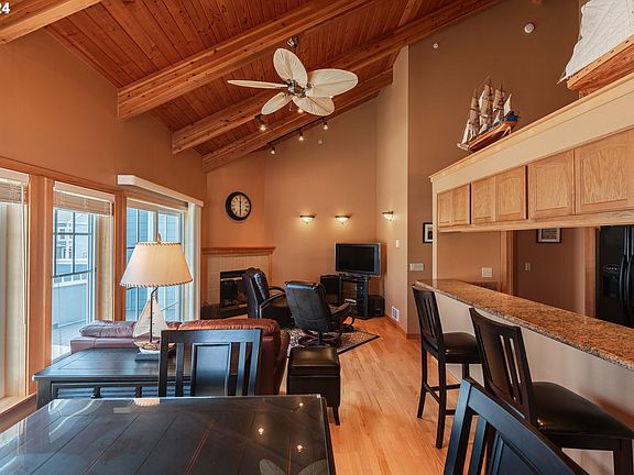 Inviting coastal living at Face Rock Village located across from Face Rock State Park beach access. This immaculately maintained unit is completely furnished and move-in ready! Stunning features include a light-filled living area, propane fireplace, hardwood floors, vaulted wood beam ceilings and ceiling fan. Kitchen featuring granite countertops, spacious breakfast bar. There are two balconies facing east and west. Enjoy the beautiful sunrises from the balcony off the living area. The second balcony is located off the primary suite. The perfect spot to enjoy breathtaking sunsets. The large primary bath features a separate shower and jetted tub for you to relax in after those long walks on the beach or a long day of golf. Enjoy the privacy of the covered back patio area with hedge boundary. Community Room and gym, landscaped common area, private pathway for easy walk to beach. Approximate 5 minute drive to City Park, Public Library, Sprague Community Theatre, Old Town and harbor. Ten-minute drive to world class golf at Bandon Dunes. Perfect location to enjoy all Bandon has to offer.
