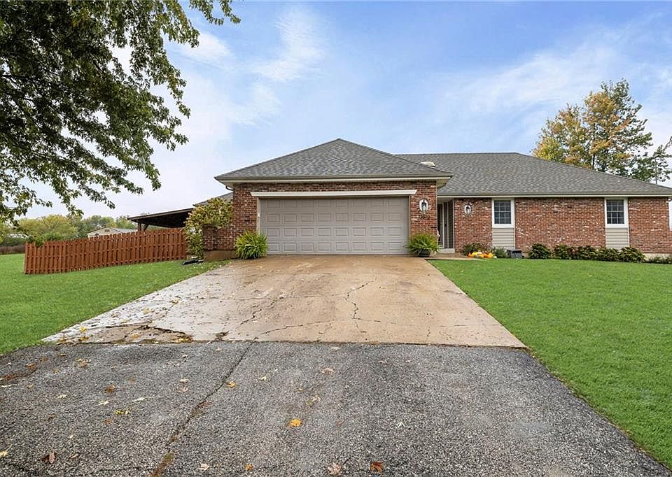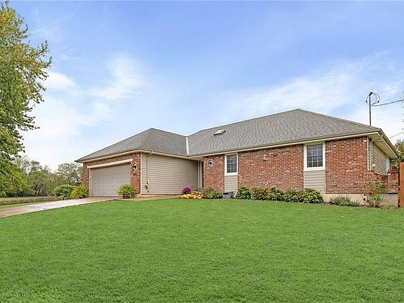 Welcome to the perfect blend of country living and city convenience with this spacious ranch style home located on just under an acre of land close to Olathe, Gardner, and De Soto. This well maintained 3-bedroom, 2-bath home sits outside of Olathe city limits and within 2 miles of Lake Olathe and KC Wine Co. The spacious main level features hardwood floors throughout, an office nook, ample natural light, a large family room, skylights, a brick fireplace, and generous closet space. Enjoy cooking in the elongated kitchen, which displays a peninsula, granite countertops, and coffee bar, with ample room for dining. Solid custom-made maple stairs lead down to the basement which includes a robust unfinished storage area, while also offering a sizable, finished family room, laundry room, and 4th non-conforming bedroom.