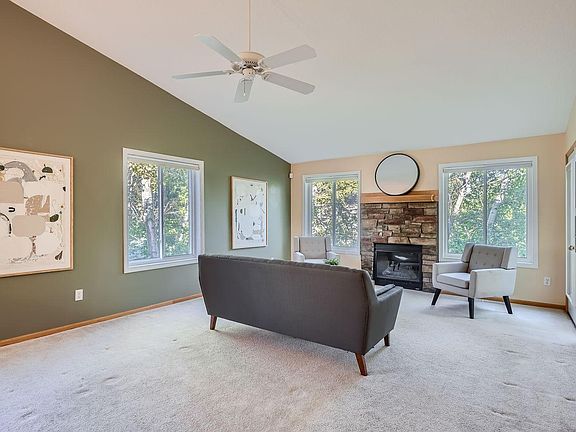 Charming and spacious single-level townhome that lives more like a single family home, located on a quiet cul-de-sac with a wooded back yard. Enjoy peaceful evenings on the new composite deck, or walk out your finished basement and sit in the back yard space. The large living room has a stone-surrounded gas fireplace and huge windows for lots of light, or watching the snowfall while you cozy up with a good book or movie. 3 bed, 3 bath, 2 car garage. There is an EV charger in the garage, so you can fire up your EV and hit the road, taking advantage of easy access to 169, 35W, CR-42, and the numerous shops, restaurants, and entertainment destinations nearby. The home is ready to be fully handicap accessible, with wide doors and hallways, and a ramp-ready garage (the wood stairs slide away for easy ramp installation, there are partial lift / grab bars in the primary bath, and other bars available for re-installation in the back room).