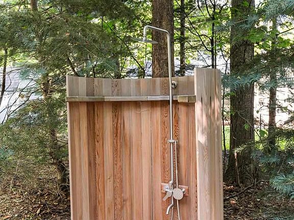Barrel saunaHot tubCustom stone wallsOutdoor showerFire pit areaTree lined neighborhoodCustom built-ins