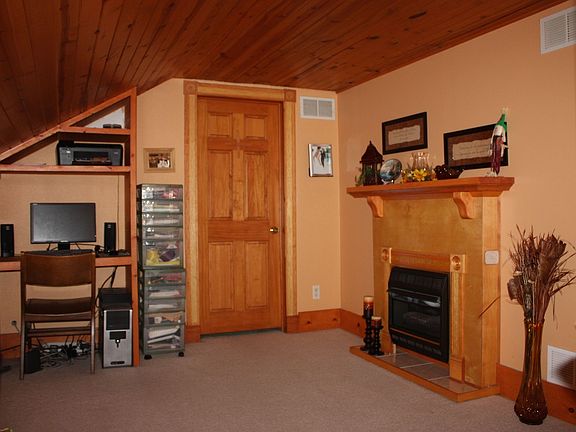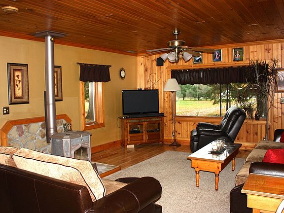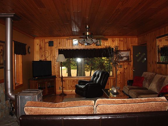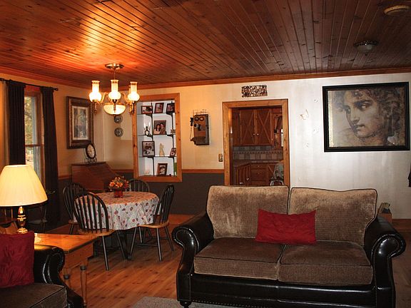 Country living awaits you with this updated 1.5 story house nestled upon private wooded 4.7 acres.1225 sq ft pole barn is ideal for workshop,hobbies,storage or parking.Open living area with soap stone wood burning fireplace,hardwood floors & lg picture window for viewing the outdoors.Garage has upstairs living area w/ 1 bed,running water and large deck. All kitchen appliances + washer & dryer included. USDA eligible property with zero down.